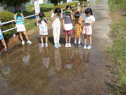 太陽とかげの位置関係について調べました。遮光プレートで太陽を見ていると、「ここにも太陽があった」と、水たまりや窓に映る太陽を観察していました。太陽とかげの関係について考えるとともに、光の反射についても疑問をもって進んで学習に取り組みました。