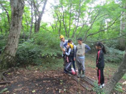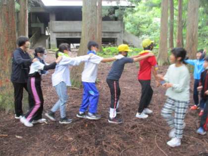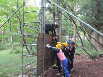 大きな壁をのりこえるなど、森の中の施設を使って、班みんなが協力する活動を行いました。