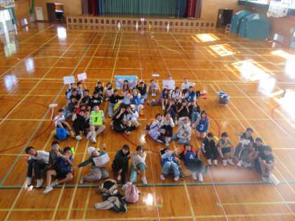 活動後にみんなで写真を撮りました。タフロンテープを敷いて、1区画の4平方メートルが分かりやすくなっています。たくさんの参加者のおかげで、さらにもしも…を想定できることができたと思います。ありがとうございました。火曜日は避難所睡眠体験をします。
