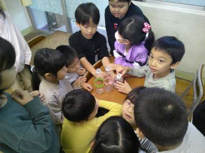 3つの様々な大きさや高さのペットボトルの中から、どれに一番多く水が入るか考えました。子供たちは、実物を見ながら友達と話し合い、真剣に予想を立てていました。