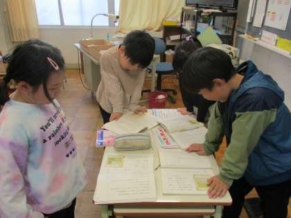 国語科「お手紙」の音読劇を、各グループで、演じる場面や配役を決めて練習しています。登場場人物の気持ちを話し合ったことを音読劇に生かそうと取り組んでいます。