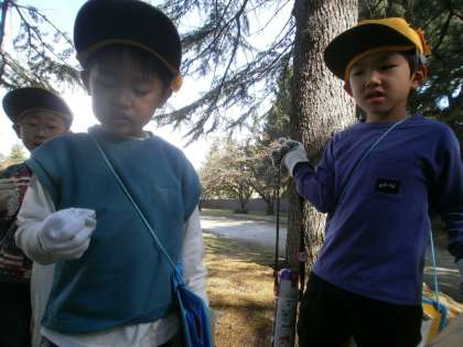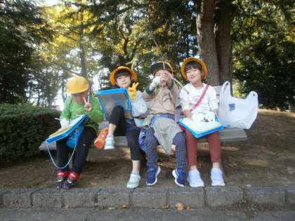上冨居公園で2回目の秋見つけをしました。前回と比べ、どんぐりや葉っぱがたくさん落ちており、子供たちは「前よりたくさん大きい葉っぱがある」「どんぐりも前よりいっぱいで嬉しい」と楽しそうに活動をしていました。
