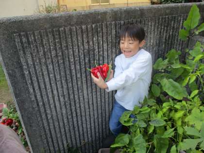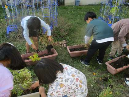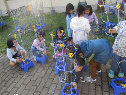 生活科で植えていた野菜の鉢や下学年玄関前を彩ったプランターの花のお世話をみんなでしました。