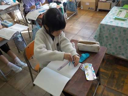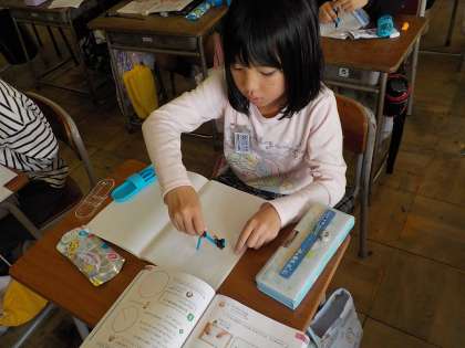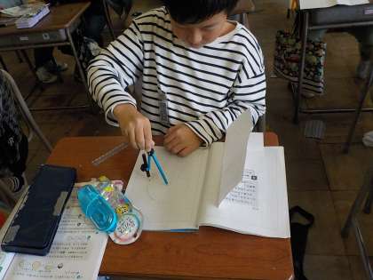 「まるい形を調べよう」の学習で、コンパスを使って円をかいています。慣れない道具で苦戦する姿も見られますが、上手にかこうと懸命に取り組んでいます。