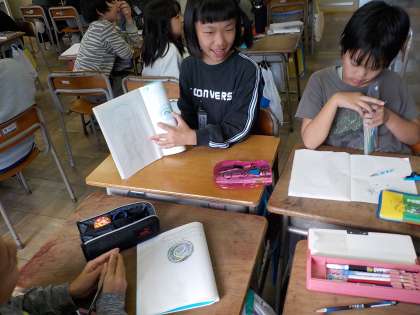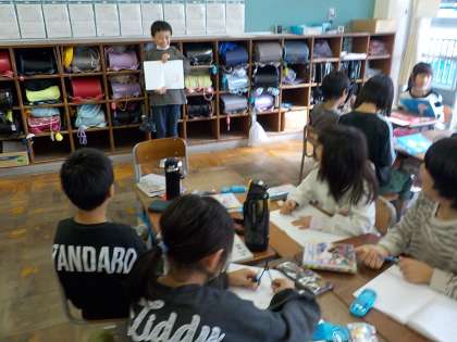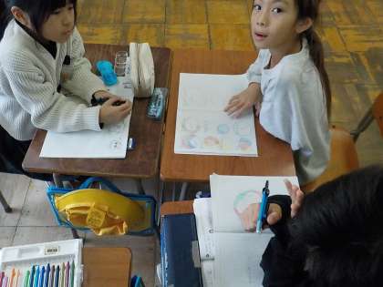 「まるい形を調べよう」の学習で、コンパスを使って模様を作りました。それぞれが考えた模様を班で発表し合いました。