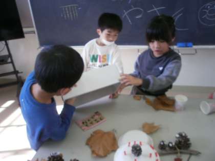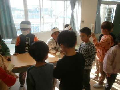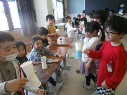 今日は1回目のあきランドを開催しました。互いのグループに行き、楽しそうに遊んでいました。迎える子供たちも、元気よく「いらっしゃいませ」「また来てください」と声をかけていました。遊んだ後は、みんなで良かったところや改善点等を話し合い、今後もっと素敵なあきランドになるように意気込んでいました。