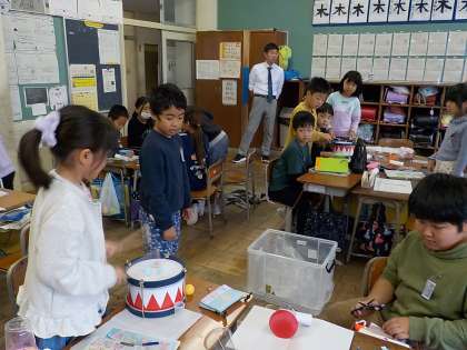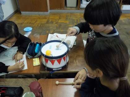 音が伝わるとき、物はふるえているか調べる実験をしました。いろいろな物を試しながら、ふるえる様子を調べ、ノートにまとめました。