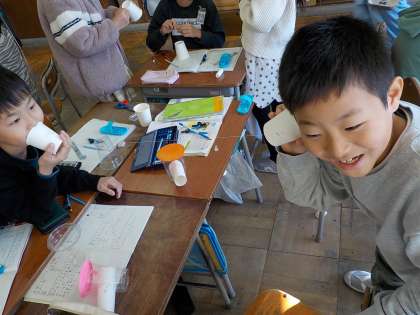 音をつたえる物は震えているのかを調べるために、糸電話を使って実験しました。音がつたわる様子が楽しかったようで、友達と協力して実験していました。