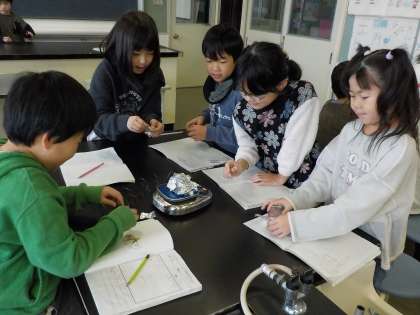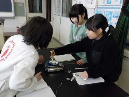 電子てんびんを使って、ものの重さを量りました。アルミニウムはくをそのままてんびんにのせたり、細かくちぎったり丸めたりして量りました。形は変わっても、重さは変わらなことがよく分かりました。