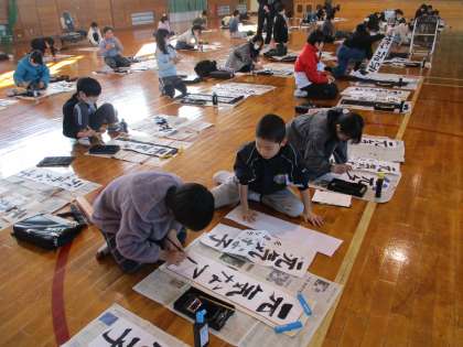 始業式を終えた後、書き初め大会を体育館でしました。「元気な子」という字を二学期から練習して冬休みを経て、本番に取り組みました。本番を終えた後に感想を聞くと「今までの練習では上手く書けなかった字を上手く書くことができた」と笑顔で答える子や「冬休みの方が上手く書いていた」と悔しがる子等がいました。独特の緊張感の中、集中して取り組んだからこその言動と感じます。このような経験も重ねて5年生に向けて成長していくことができるよう支援していきたいと思います。今年度もよろしくお願いします。