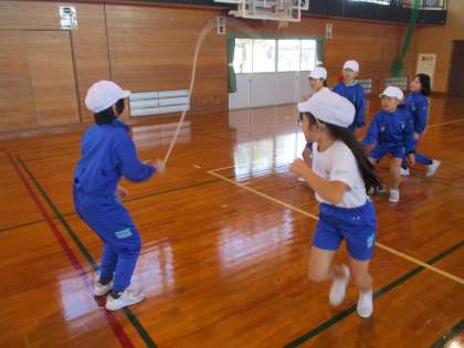 大縄飛びの様子です。1月25日に学年の団ごとに記録を測る大縄大会があります。子供達は、本番に向けて体育の授業や休み時間を通して熱心に練習しています。子供達同士で温かい声を掛け合い、記録の向上を目指す姿がたくさん見られ感心しています。