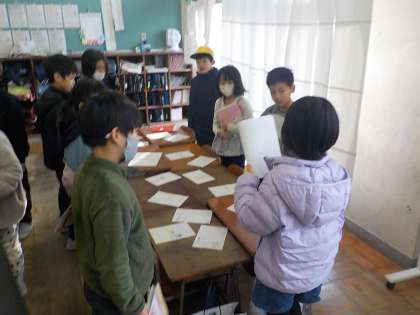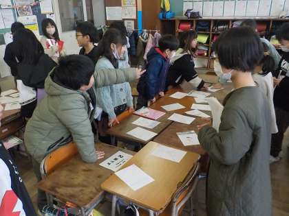 3つのグループに分かれて、一人一人が作った音訓カルタを持ち寄って、カルタ大会を行いました。どの漢字が使われているか考えながら、友達が読み上げるのを真剣に聞いていました。