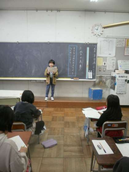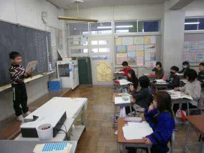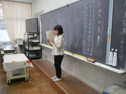 国語科「たぬきの糸車」で、自分の好きな場面の文と絵を描きました。そして、自分の好きな場面をクラスのみんなに紹介しました。