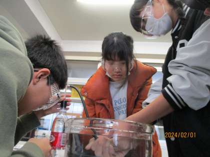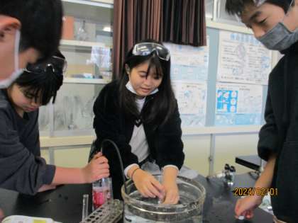 理科では水溶液の性質とはたらきについて学習しています。写真は炭酸水には何が溶けているのだろうか実験しているところです。班の友達と協力して取り組みました。
