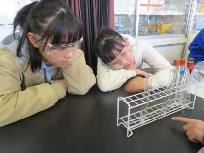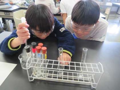 写真は酸性の水溶液は金属を溶かすのかどうか実験している様子です。実験の方法を確認しながら安全に取り組みました。