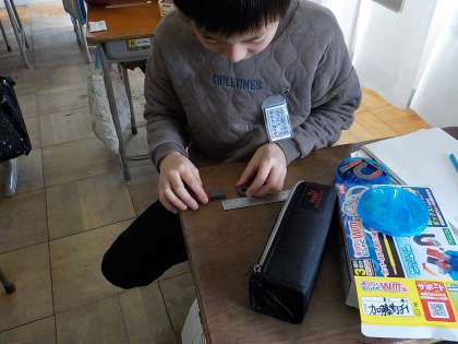じしゃくは鉄につくという性質を学習し、その学習をいかして、子供たちはじしゃくについて興味をもったことを調べています。「じしゃくの力がはたらくきょりは?」「じしゃくがつく向きに違いはあるのか?」など、自分の課題に合わせて実験方法を考えています。