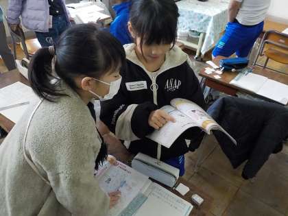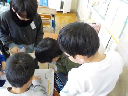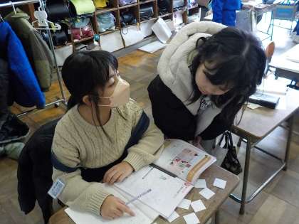 三角形の性質を友達と一緒に話し合いながら考えています。