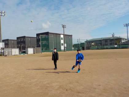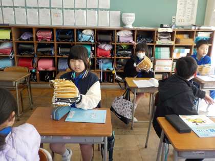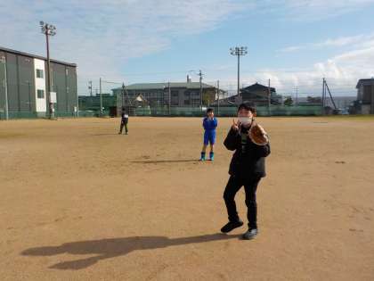 天気がよかったので、グラウンドでキャッチボールをしました。初めグローブを触る子供も多く「軽い!」「どうやって使うの?」「すごーい!」とみんなどきどきわくわくした様子でした。