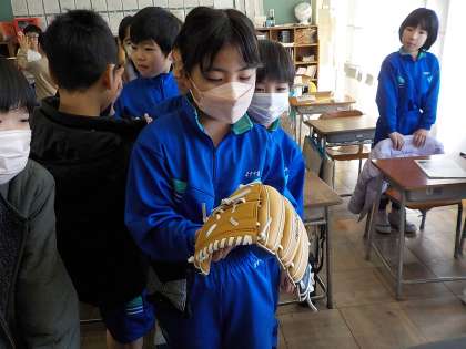 大谷選手からいただいたグローブをつけてみたり、キャッチボールをしたりしました。待ちわびていた子供たちが多く、持った時に喜ぶ子がたくさんいました。ぜひ、野球に興味をもってほしいと思います。