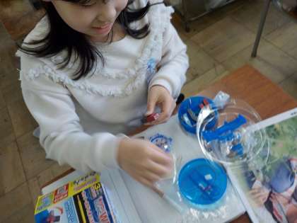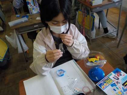 磁石につけた鉄は磁石になるのかを調べる実験をしました。磁石につけた鉄を他の鉄に近付て引きつけるか調べたり、方位磁針に近付けて極があるか調べたりしました。