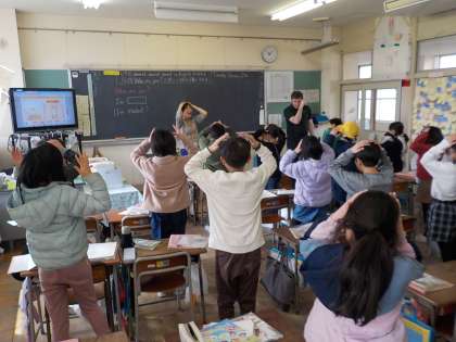 英語の歌に合わせて、体を動かしています。発音もとても上手になり、子供たちも楽しく活動しています。