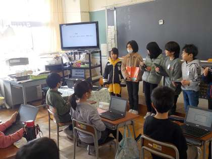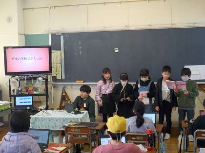 団で考えた学校のじまんを発表しました。どの団も文のつながりや写真の提示の仕方を意識し、よく考えられた発表になっていました。