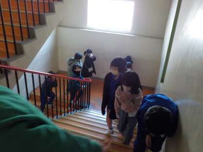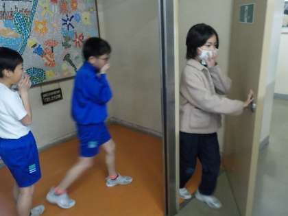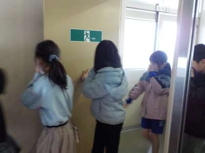 防火扉を通る練習をしました。ハンカチを当てて姿勢を低くしたり、次の人がぶつからないように扉をおさえたりするなど、実際の火災を想定した動きができていました。