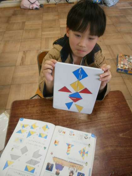 色板を用いて、いろいろなかたちをつくる学習をしました。教科書に載っているかたちだけでなく、ロボットや広田小学校等、試行錯誤しながら様々なかたちのものをつくっていました。