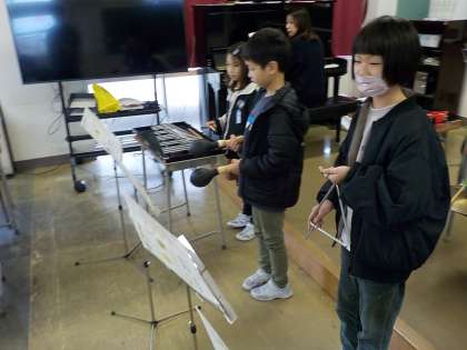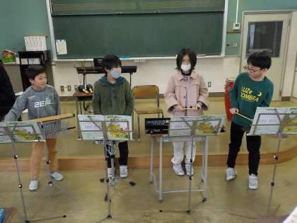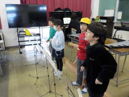 楽器の組み合わせ方や重ね方を考えて、まほうの音楽をつくりました。みんなの前での発表は緊張していましたが、タイミングを合わせて演奏しました。