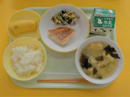 今日の給食は、ごはん、牛乳、赤魚の塩焼き、ゆかり和え、みそ汁、バナナでした。「おいしい!」とおかわりをする子供もたくさんいました。