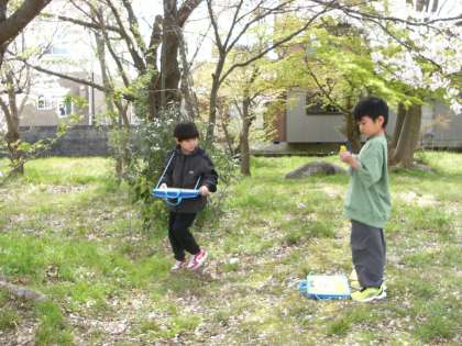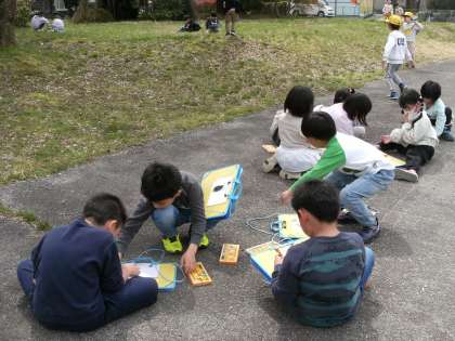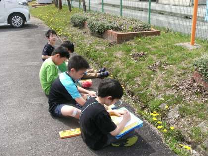 花や虫、いろいろなものを見つけ、見つけたものを画用紙に描いています。