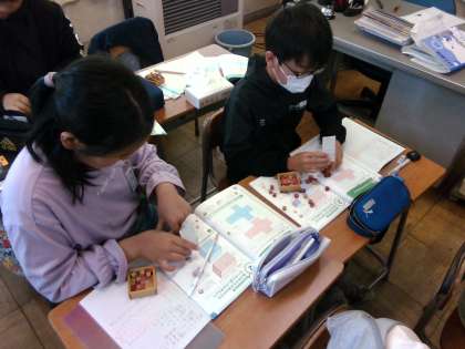 算数科「直方体や立方体のかさの比べ方と表し方を考えよう」の学習では、子供たちは1立方センチメートルの積み木を直方体や立方体の箱に敷き詰めて、いくつ入るか確かめました。