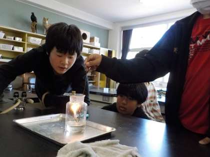 酸素の中に火を入れた時には大きな反応があり、歓声があがりました。