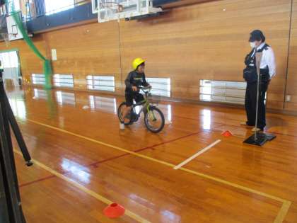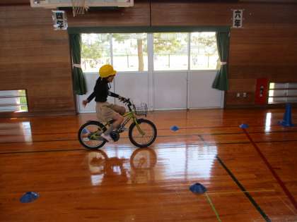 自転車安全教室を行いました。まず、自転車の乗り方や点検の仕方について教えていただきました。自転車の乗り降りは自転車の左側からすることや、左側のブレーキから握ること等、自転車の乗り方を知り、子供たちは大変驚いていました。次に、実際に自転車に乗り、教えていただいたことを生かしながら乗っていました。