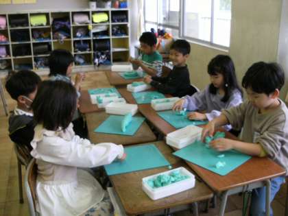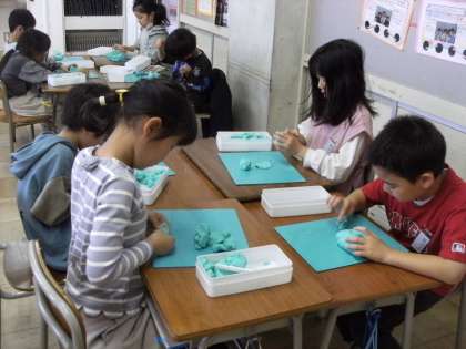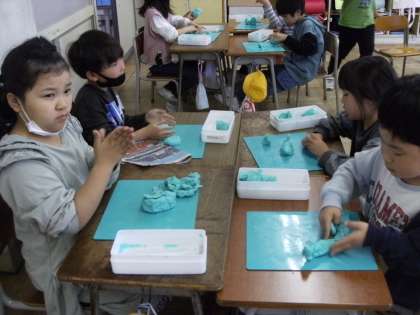 粘土を握ってできたかたちが何に見えるか考えたり、粘土に指で跡を付けたりして、いろいろな作品をつくりました。
