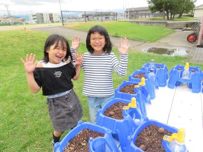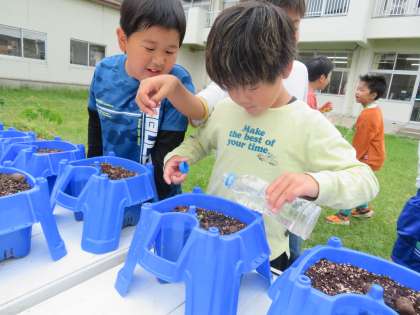 理科の学習で育てているホウセンカの芽が出ていました。ホウセンカの芽が出てとっても喜んでいた子供たちです。「大きく育ってね」という気持ちをこめて水やりをしていました。