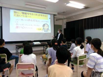 今日は、富山市教育センターからお越しの講師の先生に、情報モラル講座を開いていただきました。子供たちは、SNSの危険性や安全な使用の仕方を学びました。