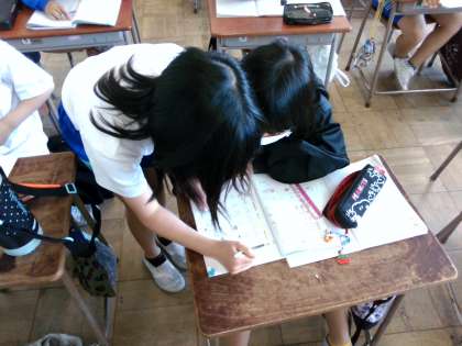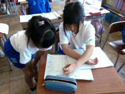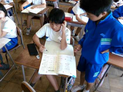 算数科「わり算」の学習では、わり算の筆算の仕方を考えました。友達に質問したり、一緒に解いたりする姿が見られました。