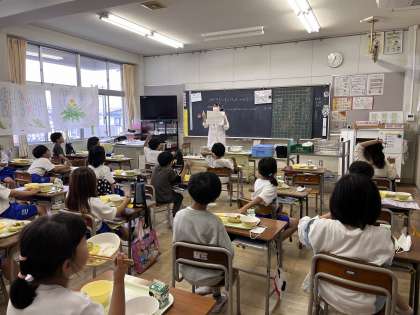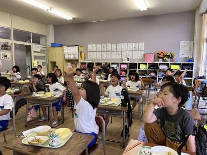 今日の給食は、栄養教諭と一緒に食べました。今日の給食についてのクイズをしていただき、楽しくおいしく給食を食べることができました。