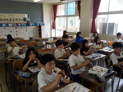 ヘッドピースと息を使って音をあそびを楽しんだ後、「シ」の音を出す練習をしました。リコーダーの支え方やタンギングの仕方を意識していました。