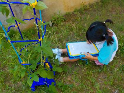 「つぼみはふわふわしていて気持ちがよい」「つぼみからピンクの色が見えているから花はピンクかな」「私のあさがおも早く花咲かないかな」等、一生懸命に観察している姿がたくさん見られました。