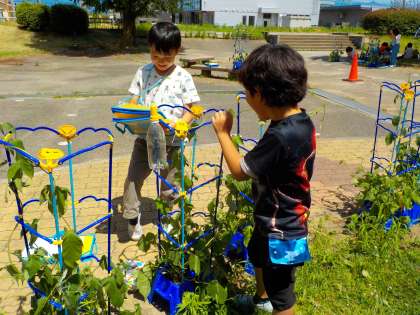 あさがおの葉っぱやつぼみを細かく観察しました。また、あさがおの花が咲いて喜んでいる子供たちの姿も見受けられました。