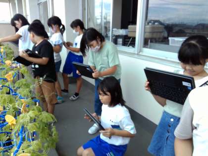 春から育てているゴーヤが大きくなりました。子供たちは「花が咲いた!」「小さい実がなっている!」と喜んでいました。