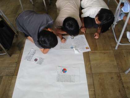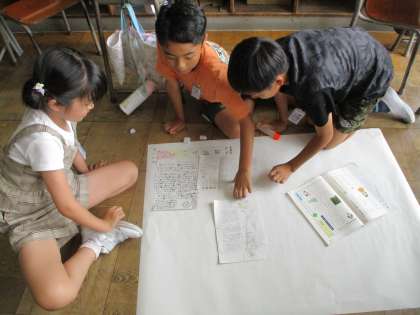 国語科「新聞をつくろう」では、グループでテーマを決め、新聞を作りました。読み手が読みたくなるような新聞にするために、割り付け等を工夫していました。