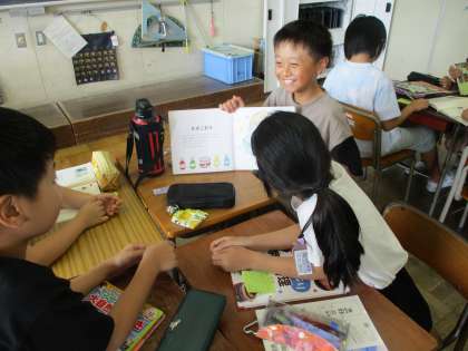 夏休みに読んだ本にポップを付けて紹介したり、夏休みの自由研究と工作を発表したりしました。一人一人とても真剣に、そして楽しく取り組んできたことが伝わってくる発表になりました。