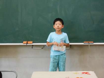 夏休みに作った一人一作品の紹介をクラスの友達にしました。どんなところを頑張ったか、工夫したかを説明しながら紹介しました。