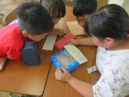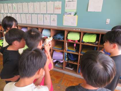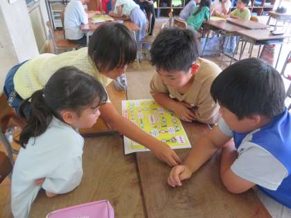 学級活動の時間に、「夏休み思い出すごろく」や「一人一作品の紹介」を行いました。思い出すごろくでは、久しぶりに会う友達と夏休みの出来事を話しながら楽しい時間を過ごしました。一人一作品の紹介では、工夫したことや頑張ったことを伝えました。友達の作品で遊んだり鑑賞したりしながら、作品のすばらしさを感じることができました。