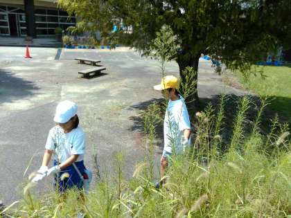 今日は、縦割り班活動でコスモスロードの除草を行いました。背丈よりも大きな雑草を一生懸命取り除いてました。