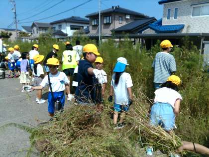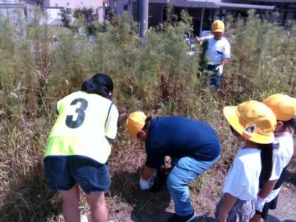 今日は、縦割り班活動でコスモスロードの除草を行いました。背丈よりも大きな雑草を一生懸命取り除いてました。