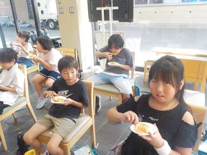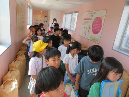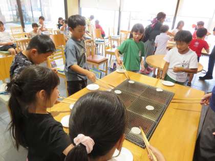 午後からは、ささら屋で工場見学や煎餅手焼き体験をさせていただきました。工場見学では、1日に240キログラムもの米が使われていることに驚いたり、働く方の服装の秘密に気付いたりと、学んだことを自分なりにまとめていました。煎餅手焼き体験では、煎餅に少しずつ焦げ色がついていくのをワクワクした様子で見つめながら丁寧に焼いていました。たっぷりと醤油がついたとても美味しそうな煎餅が焼き上がりました。